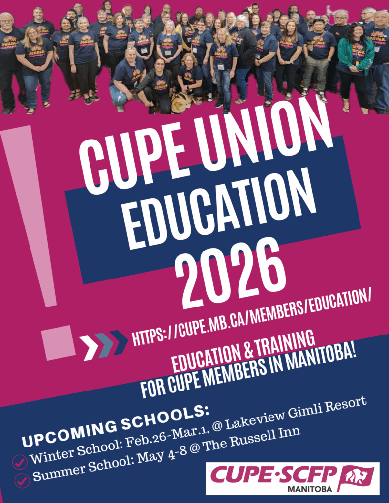 CUPE Manitoba will be holding the 28th Annual Winter School, February 26th – March 1st, 2026 in Gimli Manitoba. This is an excellent opportunity for CUPE members to build skills in labour relations, advocating for workers, and community action.