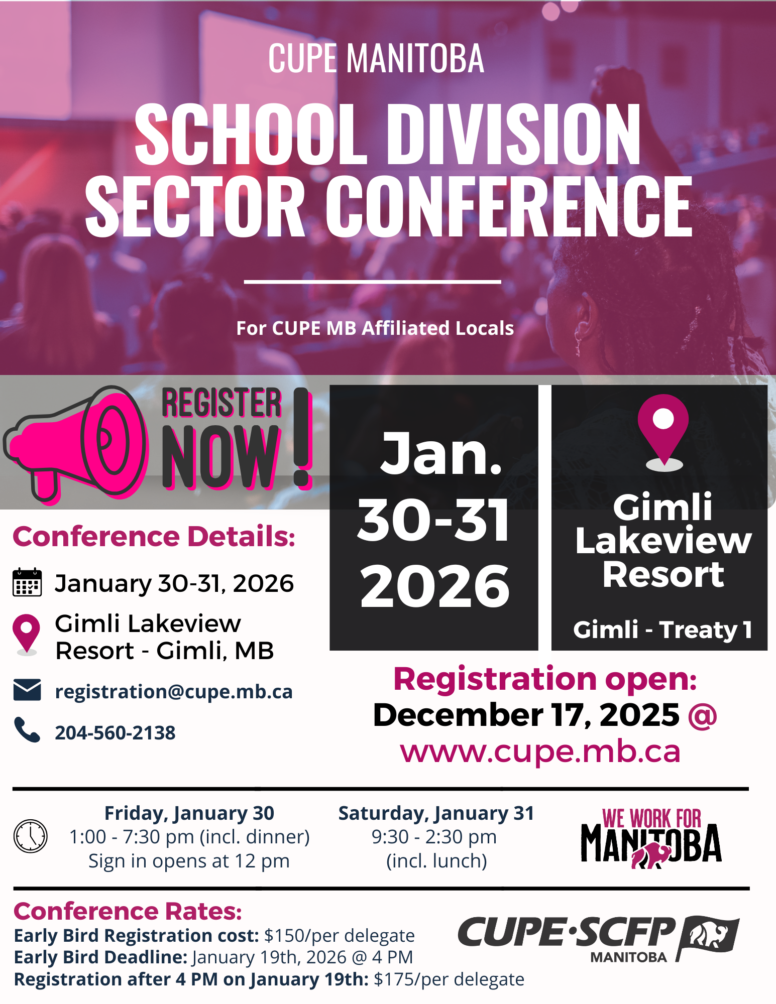 Registration is now open for the 2026 CUPE Manitoba School Division Conference taking place in Gimli, Manitoba – Treaty 1!