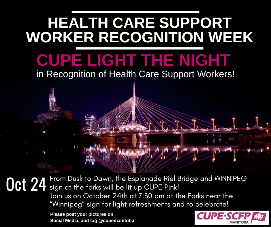 Join us in celebrating this week by visiting The Forks on October 24th, where the Winnipeg sign and Esplanade Riel Bridge will be glowing CUPE pink in recognition of all healthcare support workers.