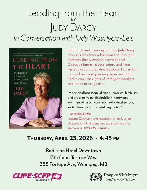 Judy Darcy’s memoir, Leading from the Heart: The Battles of a Feminist, Union Leader and Politician book launch will take place at the Radisson Hotel Downtown Winnipeg – Treaty 1, in conversation with Judy Wasylycia-Leis and with welcoming remarks by President Gina McKay.