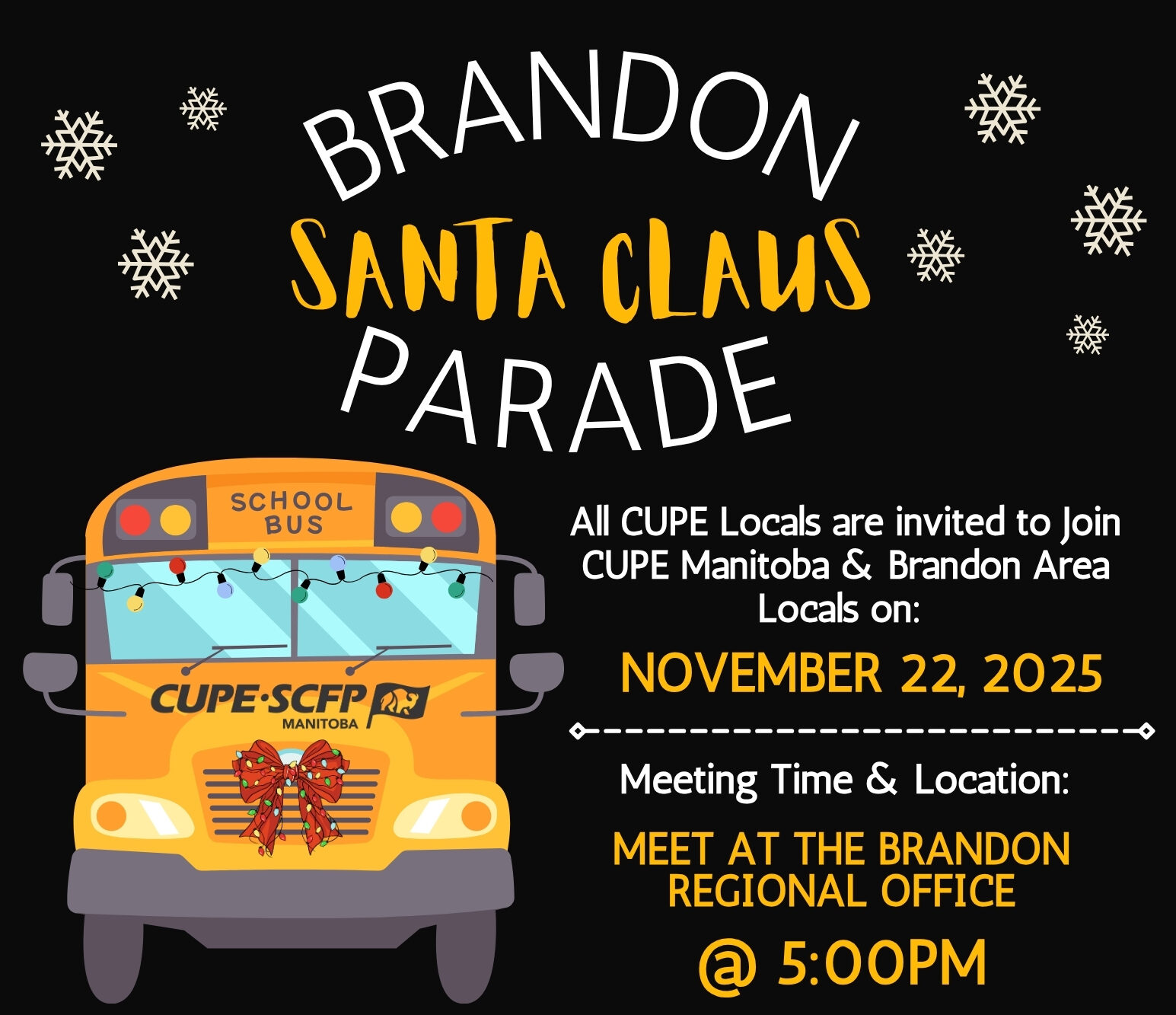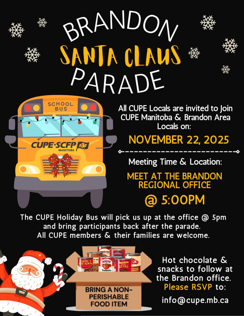We are excited to share that CUPE Manitoba and the Brandon Area Locals have entered a Local 737 CUPE School Bus & walking group entry into the Brandon Santa Claus Parade again this year! We hope you will join us.
