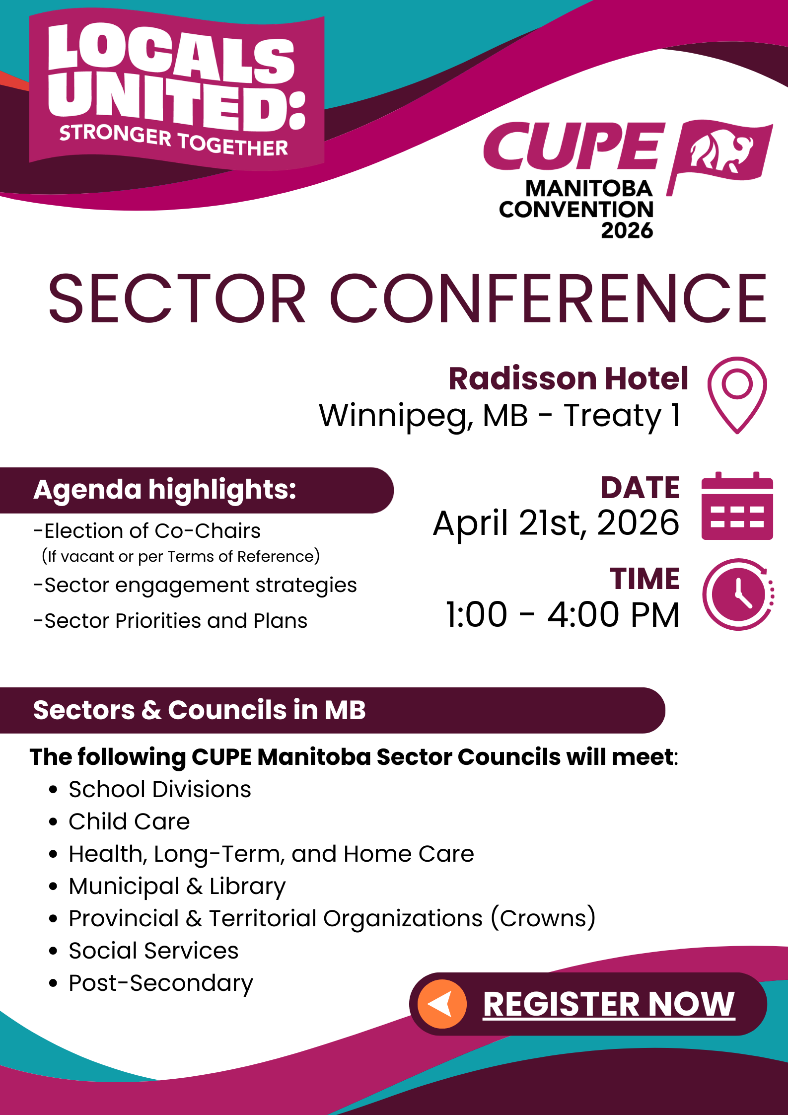 April 21st: CUPE Manitoba Sector Conference, 1-4pm. Convention Meet & Greet, New Delegates Session, and Registration: April 21st evening.