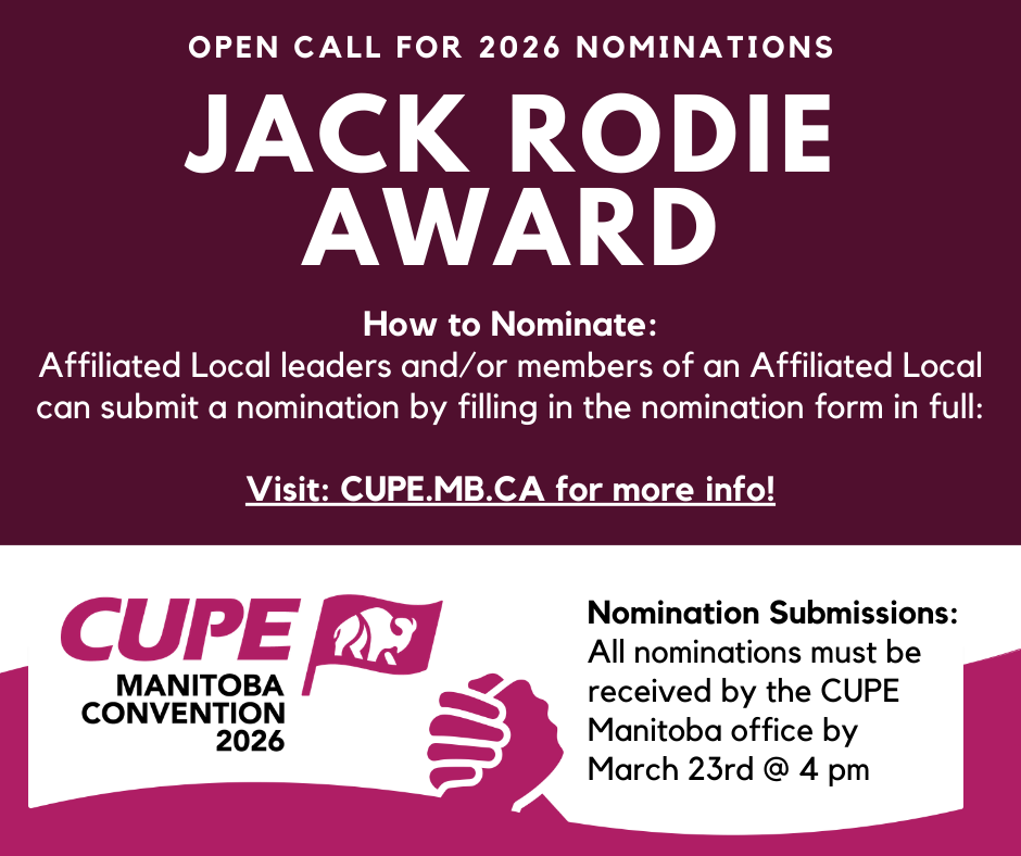 The official call for nominations is open for the 2026 Jack Rodie Award. All Affiliated Locals can submit nominations by filling in the Nomination Form in full, and submitting to the CUPE Manitoba office by March 23rd @ 4 PM.