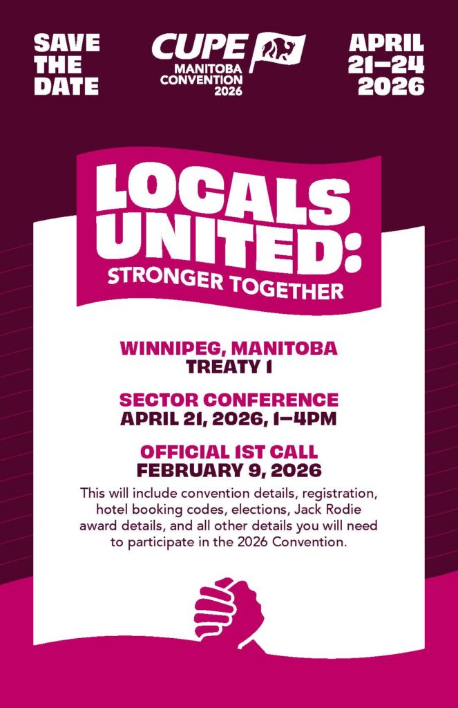 Please Save the Date for the 62nd Annual CUPE Manitoba Convention, taking place April 21st to 24th, 2026, in Winnipeg – Treaty 1, Manitoba.